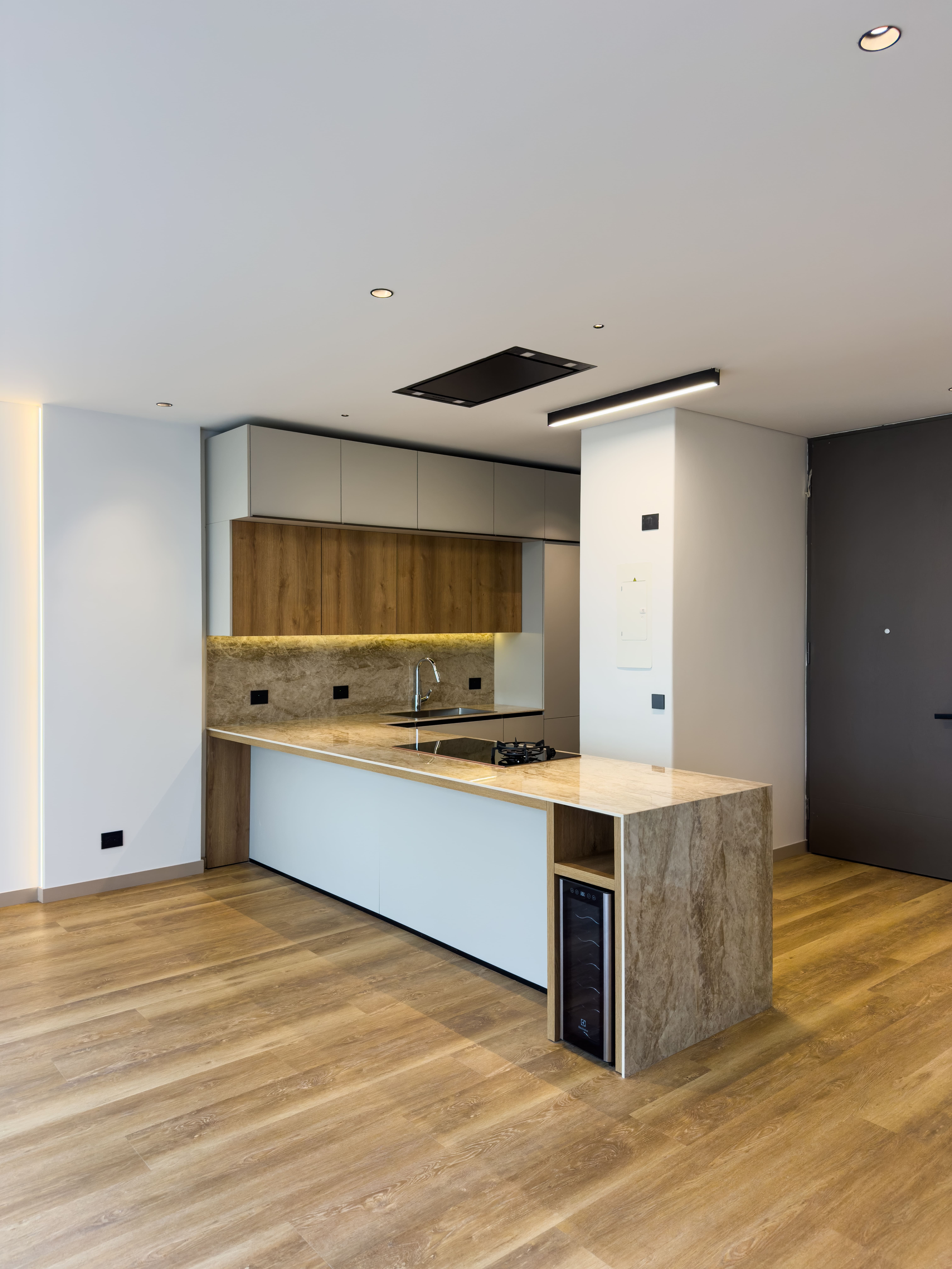 La cocina abierta, contemporánea y bien equipada, se conecta de manera fluida con el área social, logrando un ambiente moderno y funcional, perfecto tanto para el día a día como para recibir invitados.