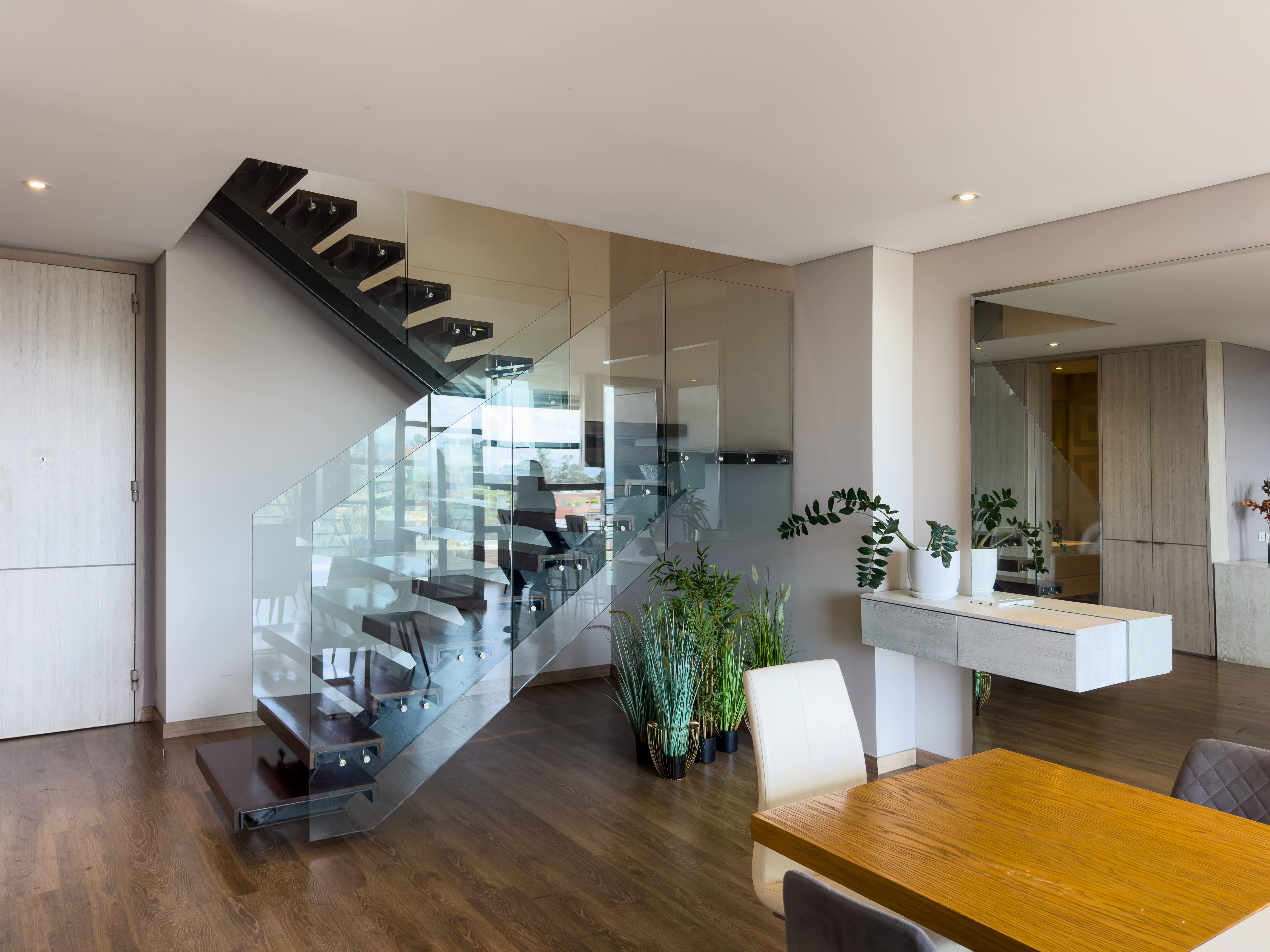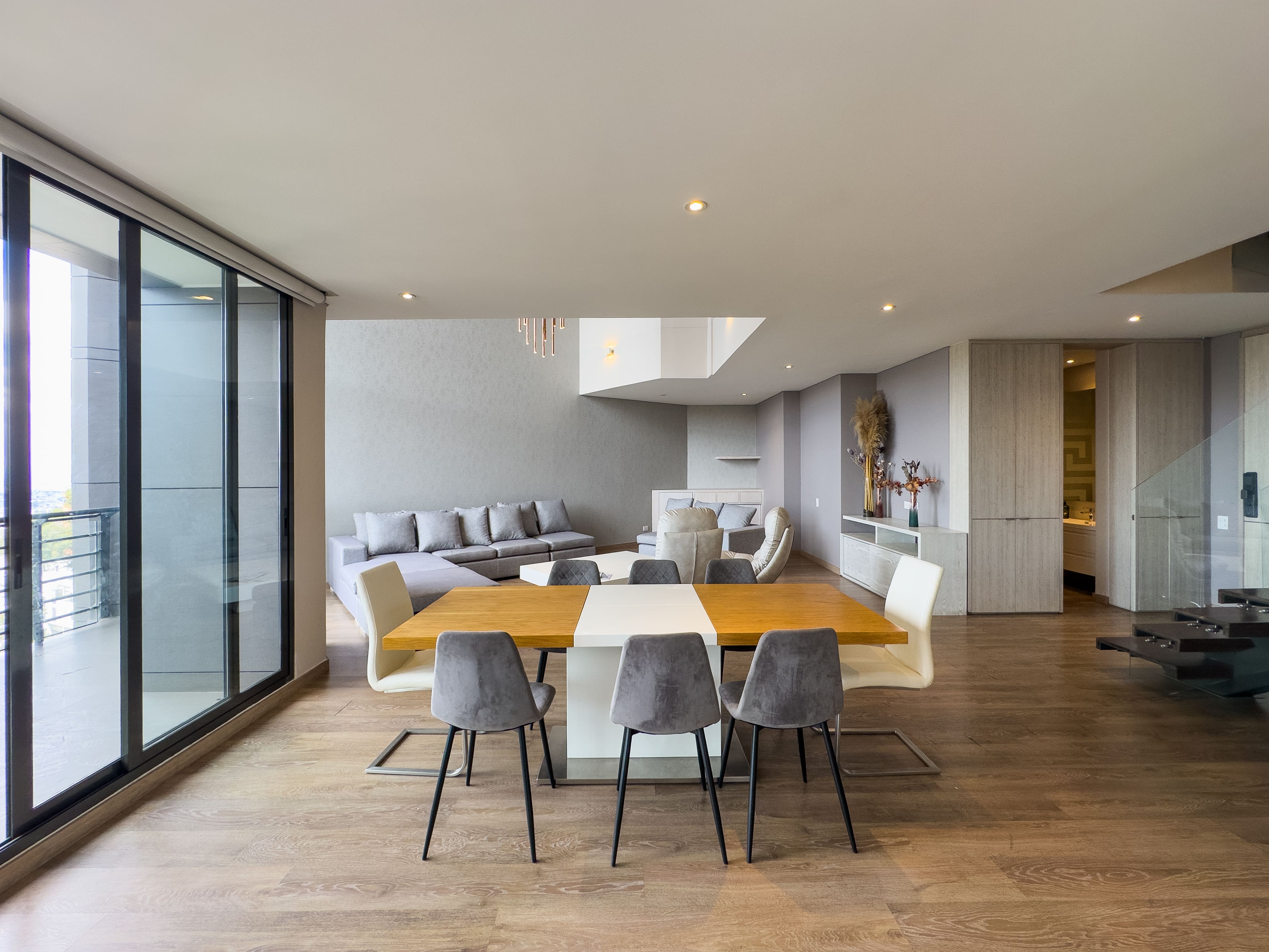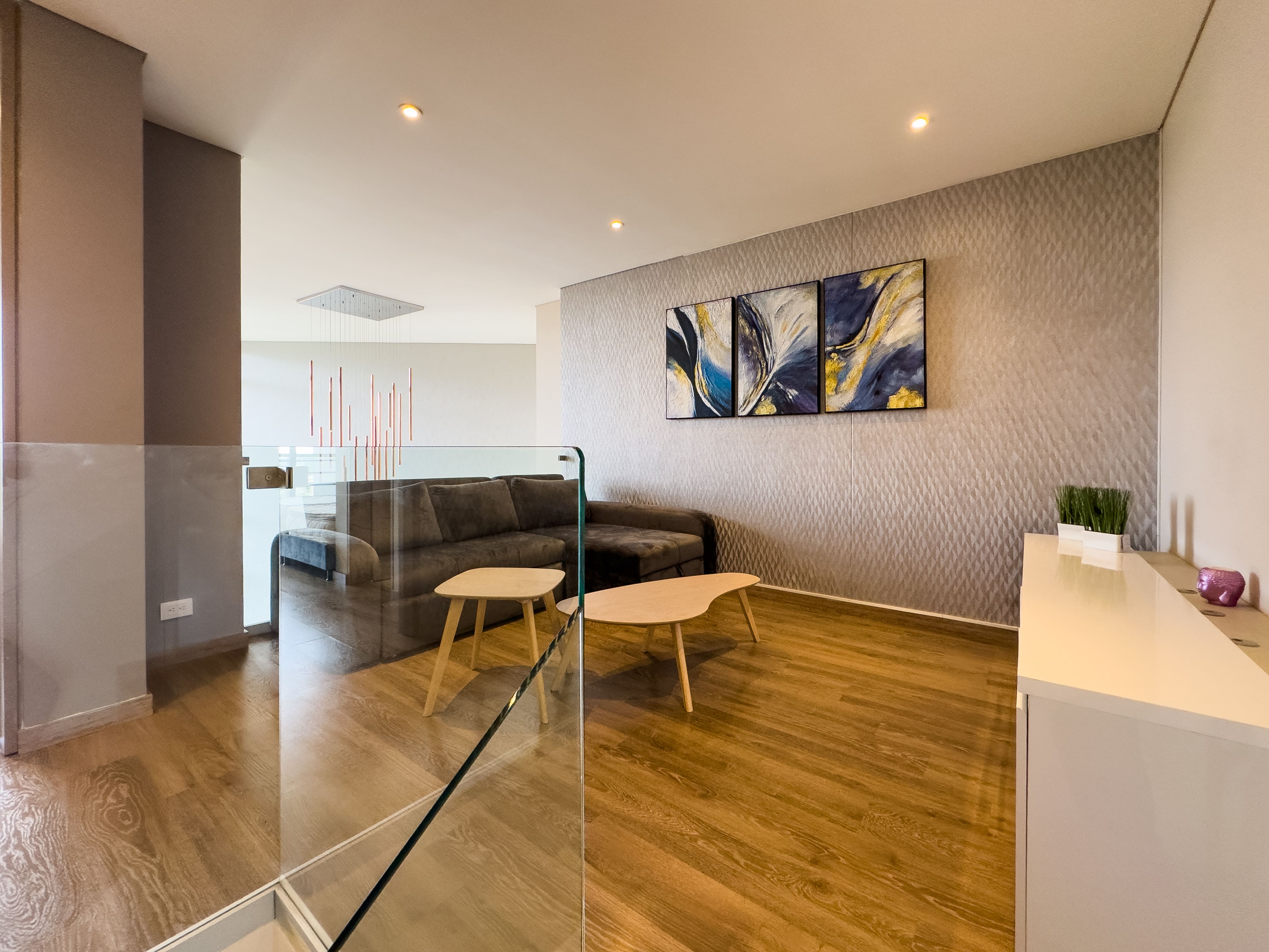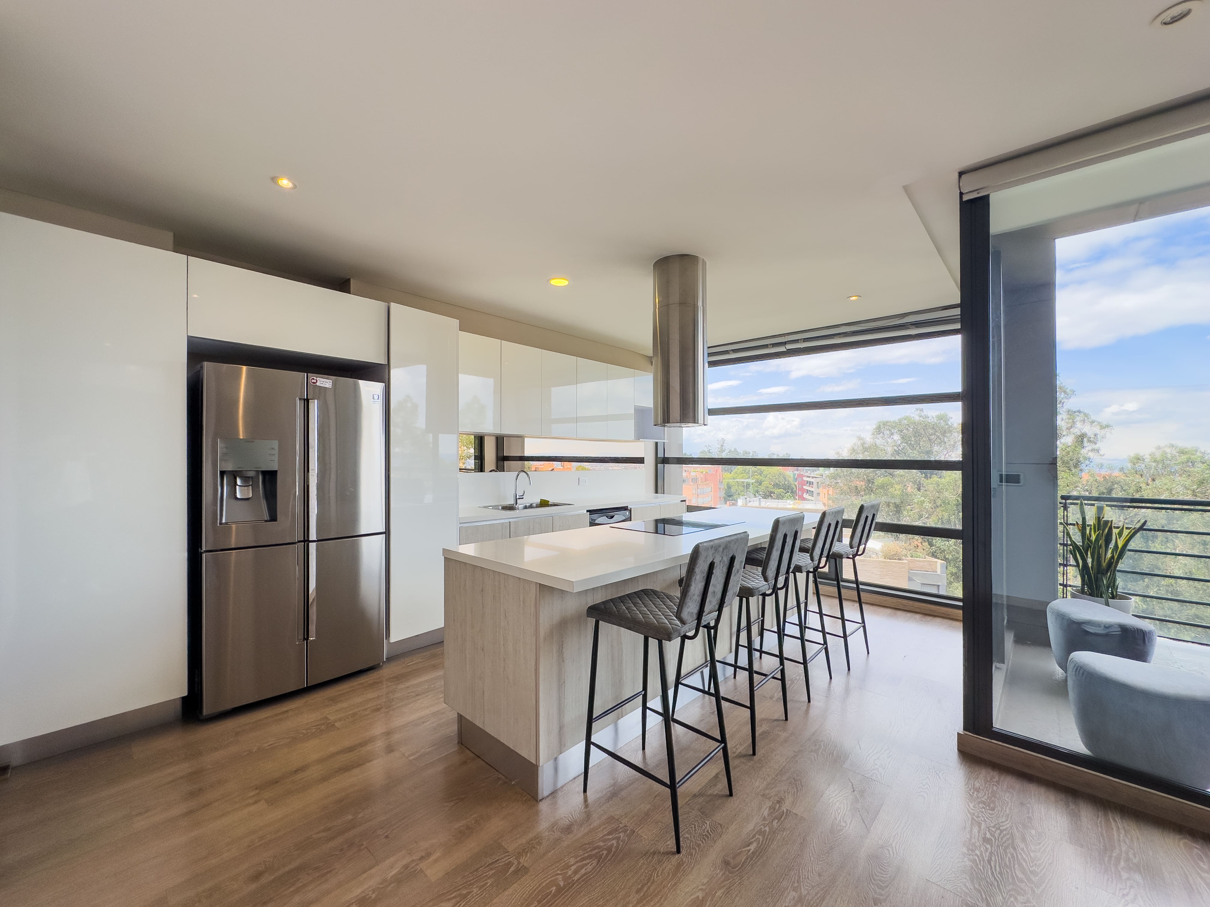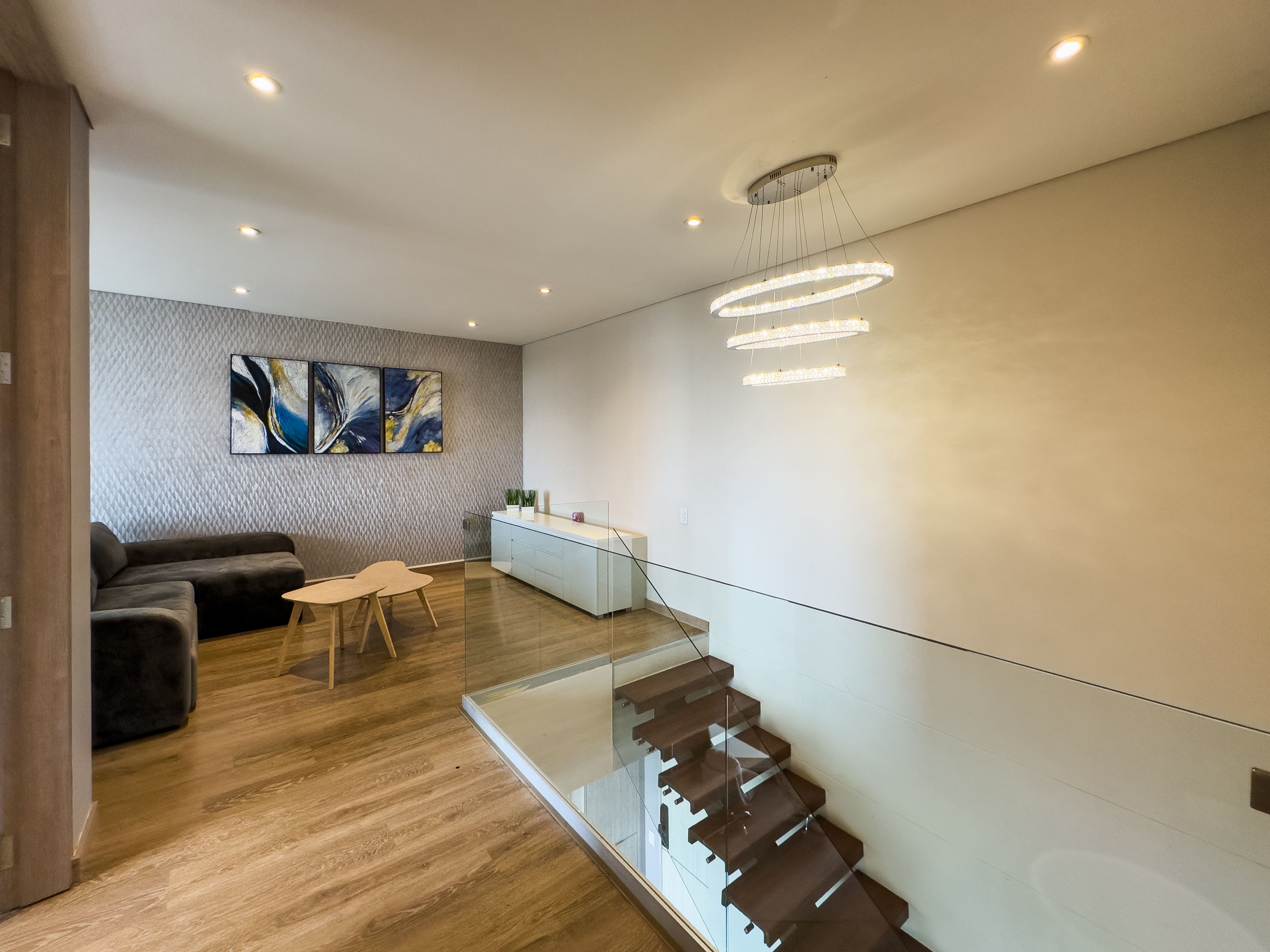En el primer nivel se desarrolla el área social: baño social, una cocina con excelente vista a la ciudad, comedor amplio y una sala de gran formato con doble altura, que se conecta a un balcón generoso, ideal para disfrutar la luz natural y el paisaje urbano. En este nivel también se encuentra la zona de ropas independiente, con cuarto y baño de servicio.