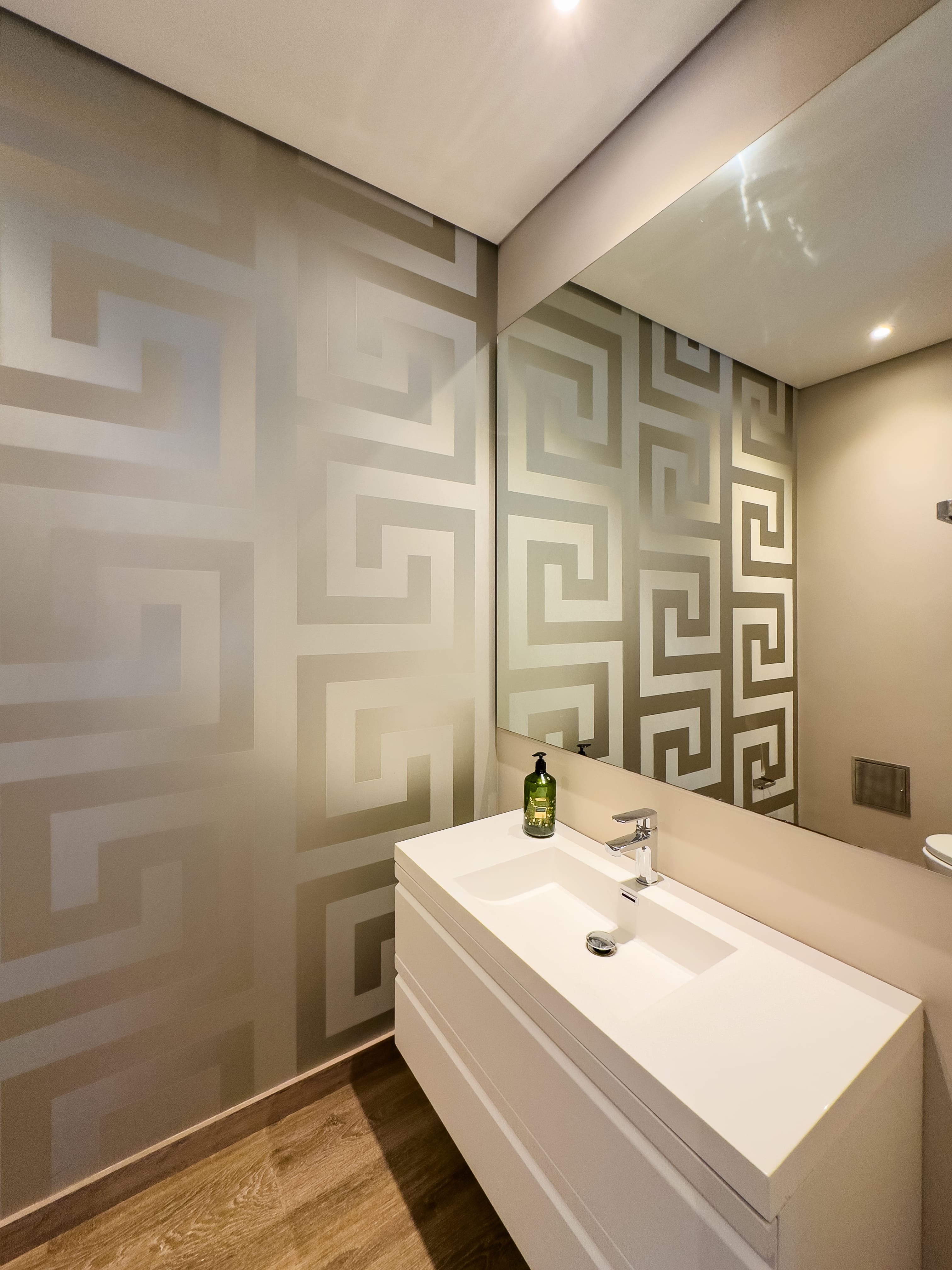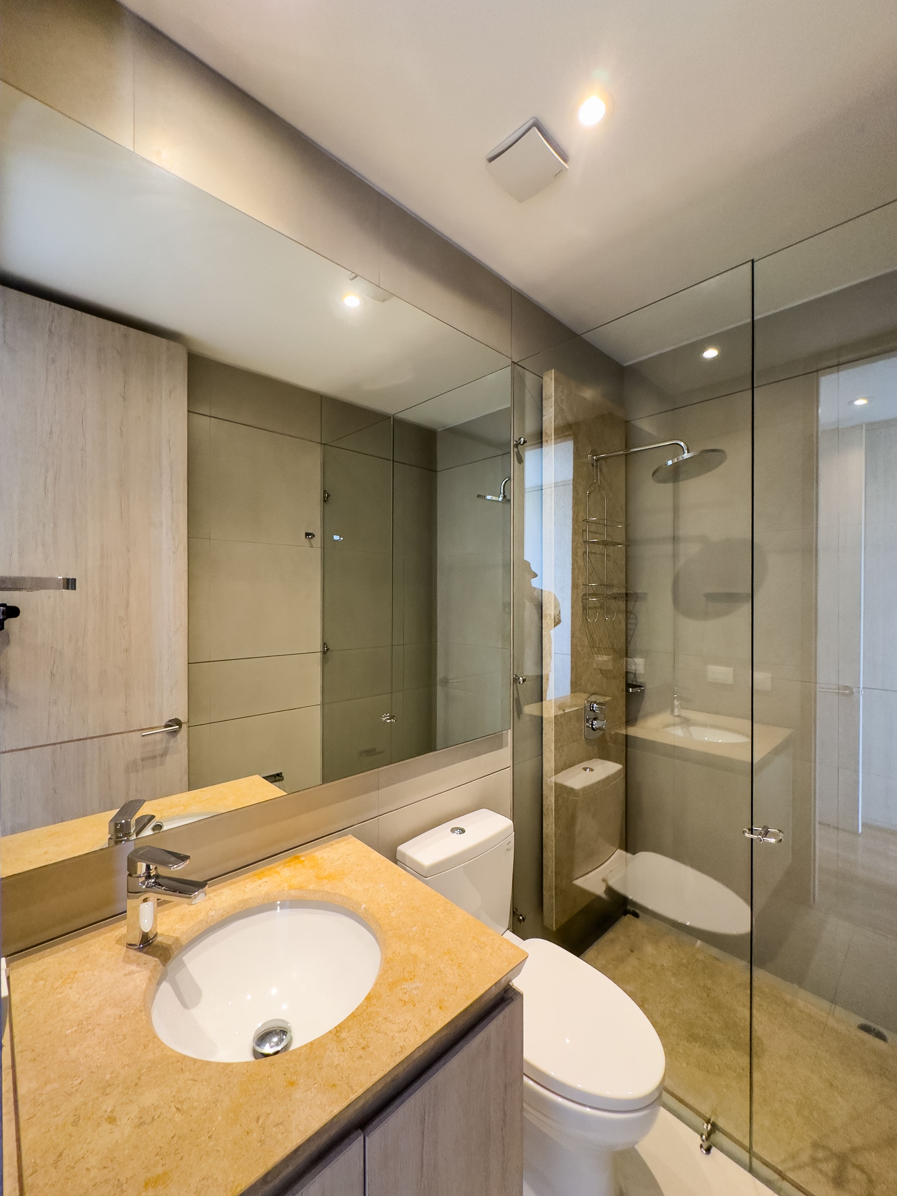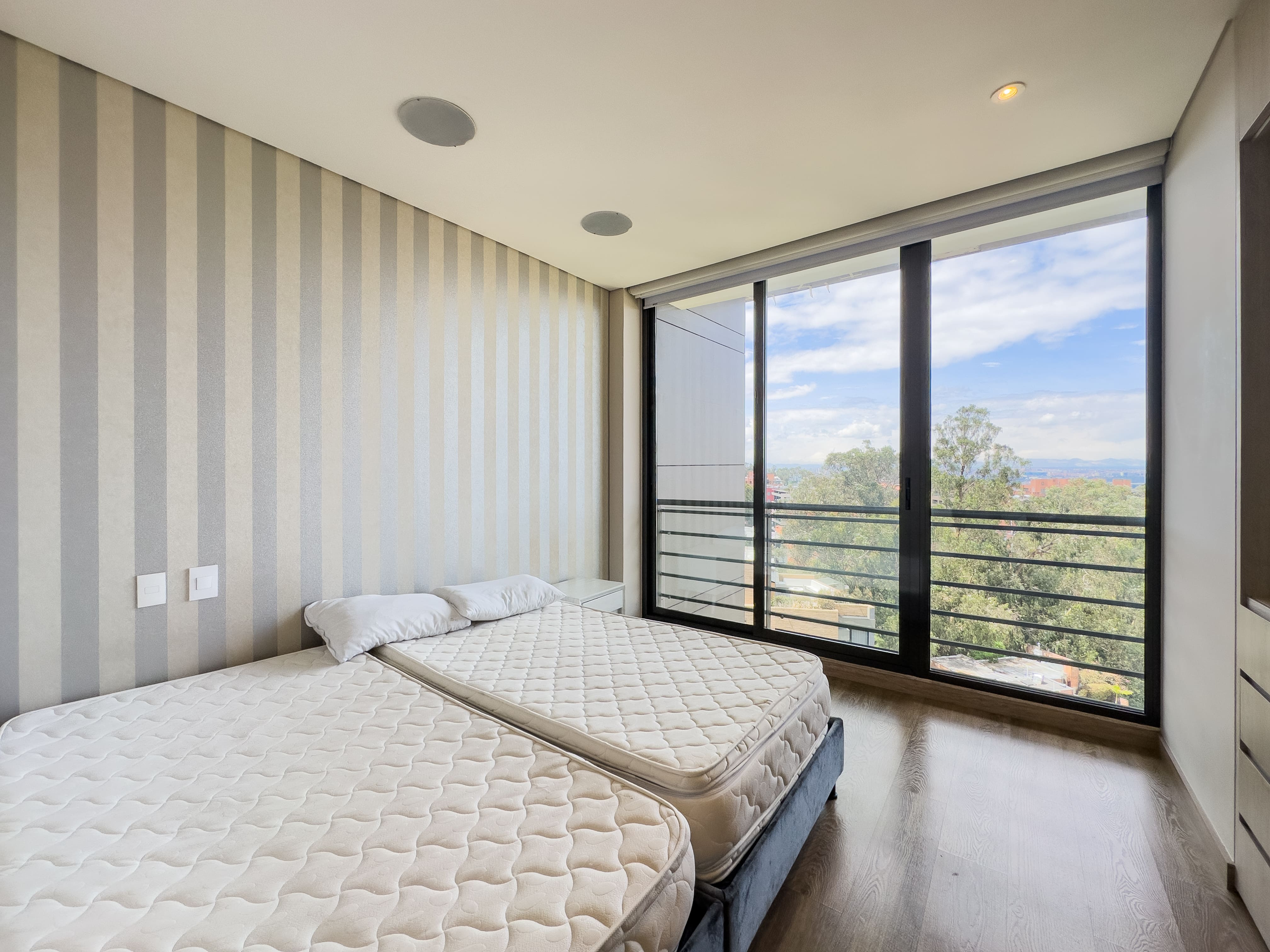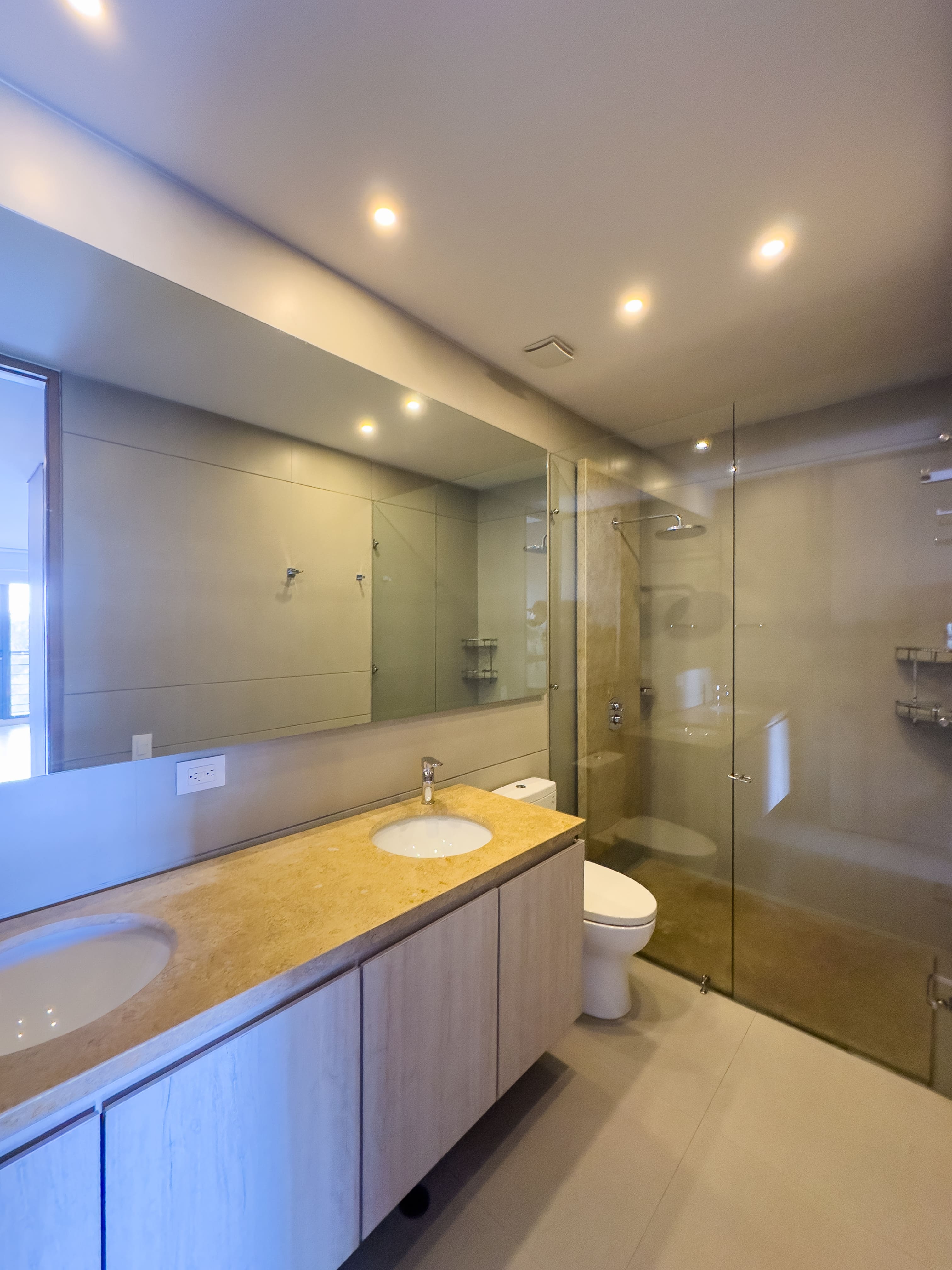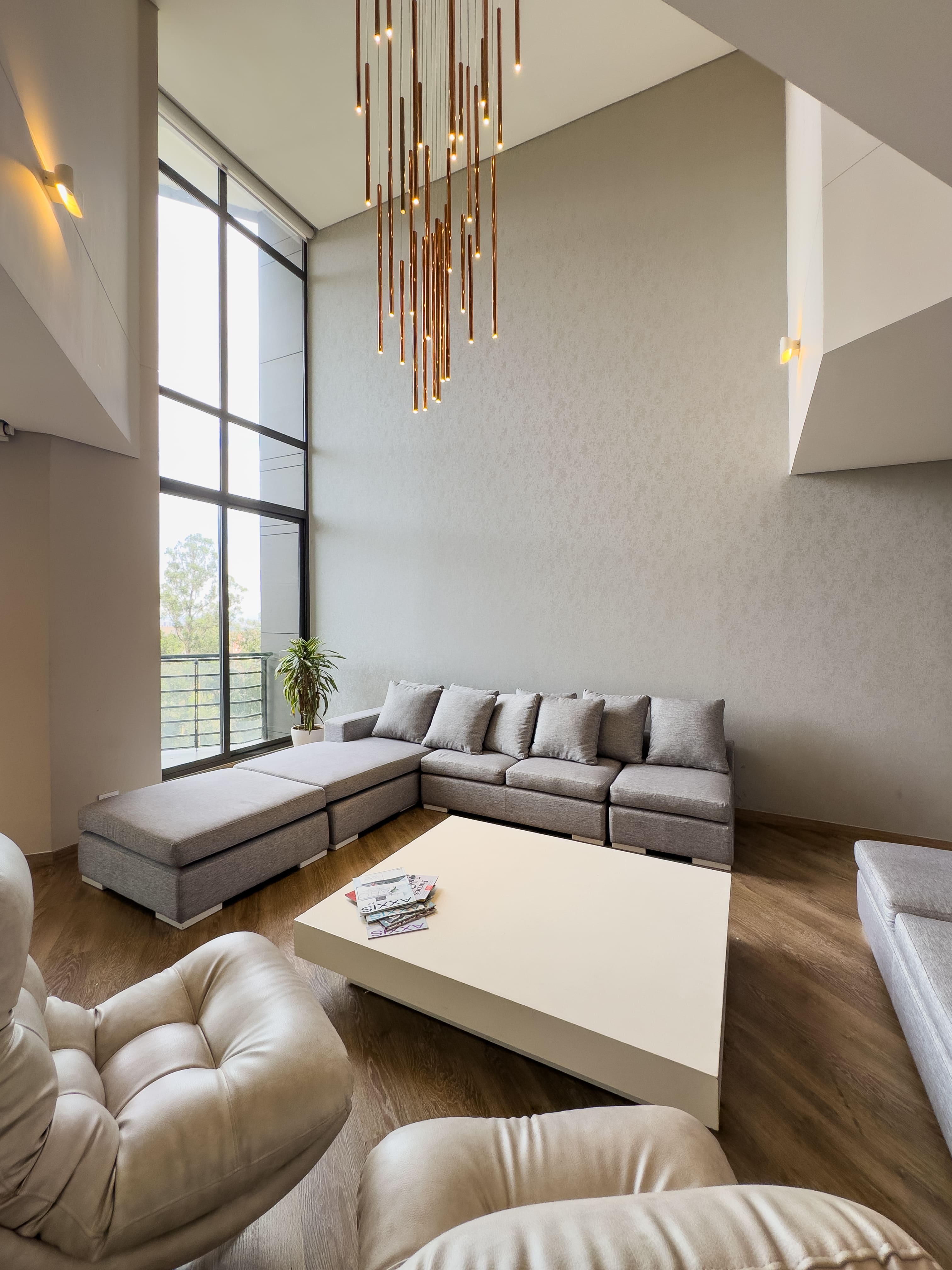 En el primer nivel se desarrolla el área social: baño social, una cocina con excelente vista a la ciudad, comedor amplio y una sala de gran formato con doble altura, que se conecta a un balcón generoso, ideal para disfrutar la luz natural y el paisaje urbano. En este nivel también se encuentra la zona de ropas independiente, con cuarto y baño de servicio.