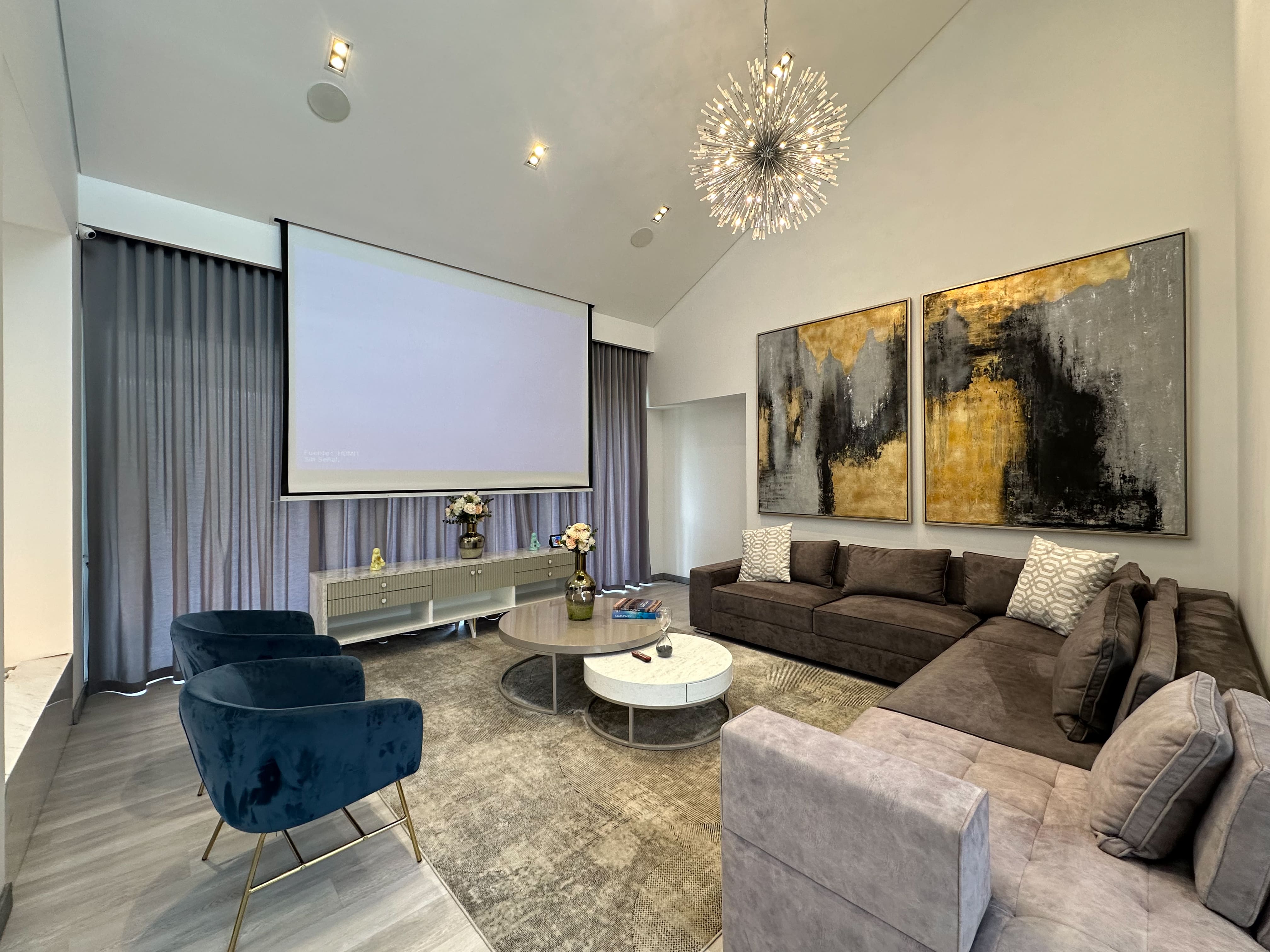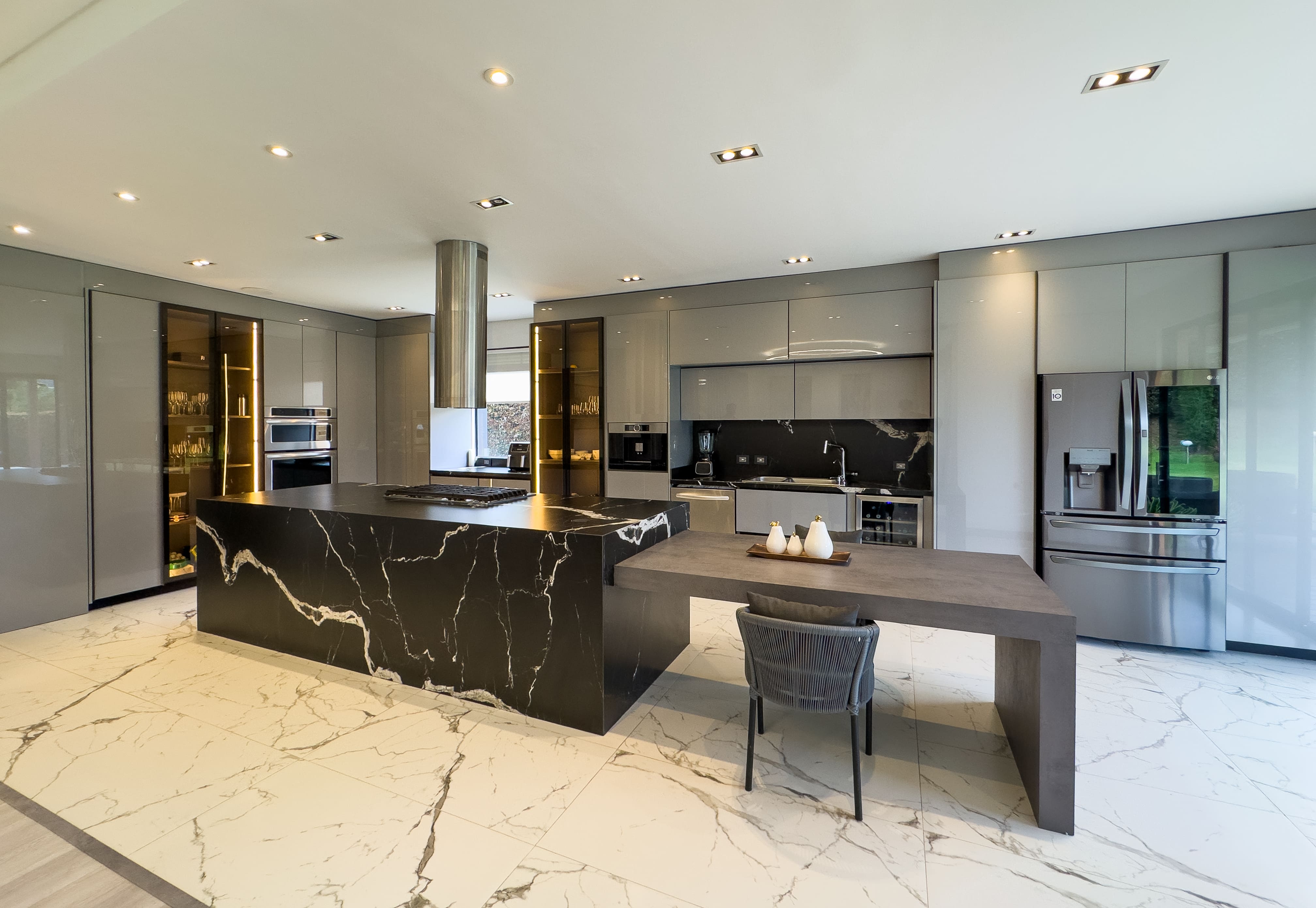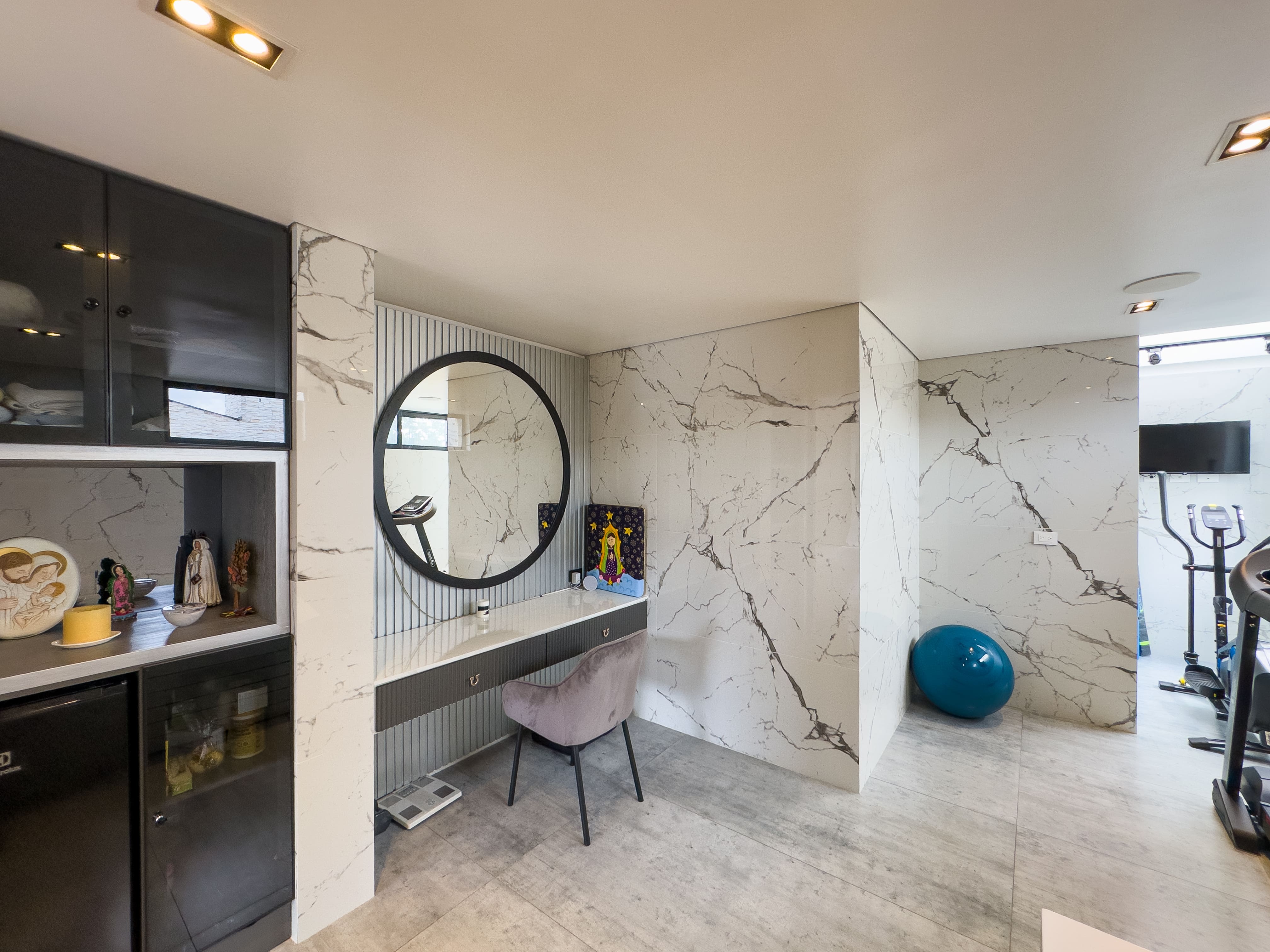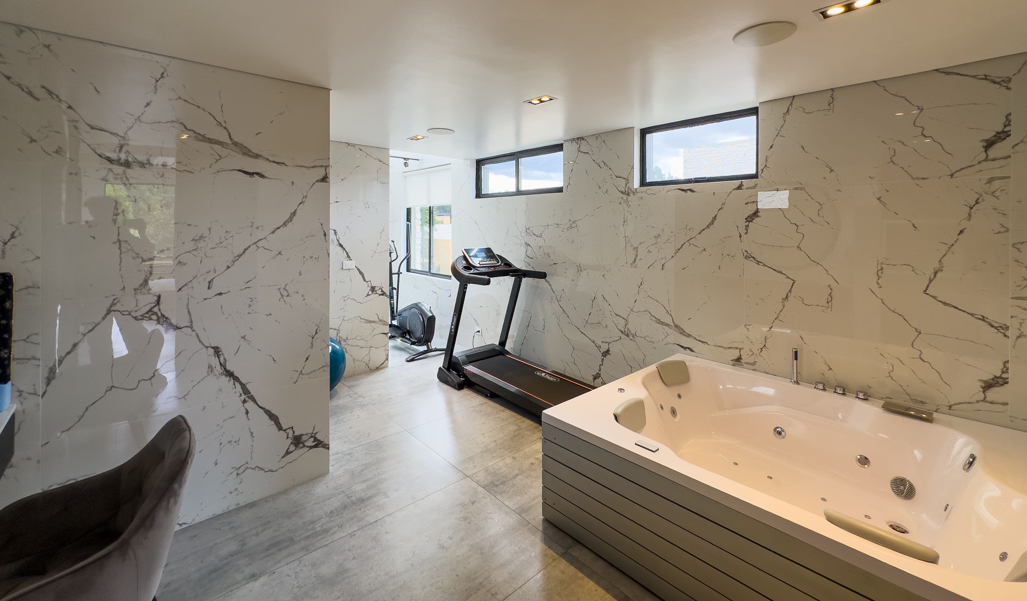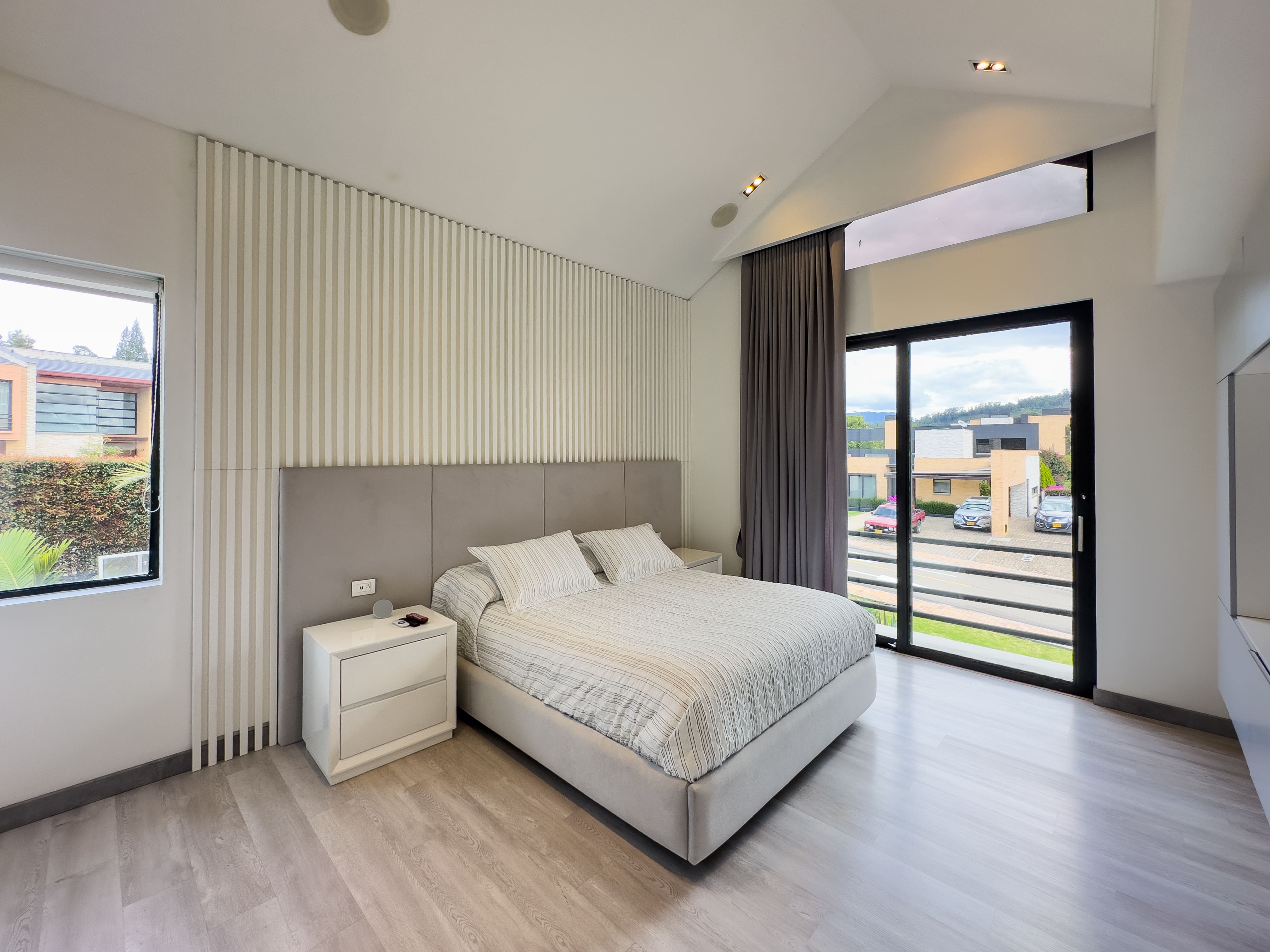 La casa ofrece tres alcobas con baño privado, con la posibilidad de incorporar una cuarta habitación en la primera planta, transformando el estudio actual en una suite adicional. En total cuenta con cinco baños y ocho garajes, un equilibrio poco común entre diseño, funcionalidad y comodidad, ideal para una vida familiar sofisticada sin renunciar al confort diario.