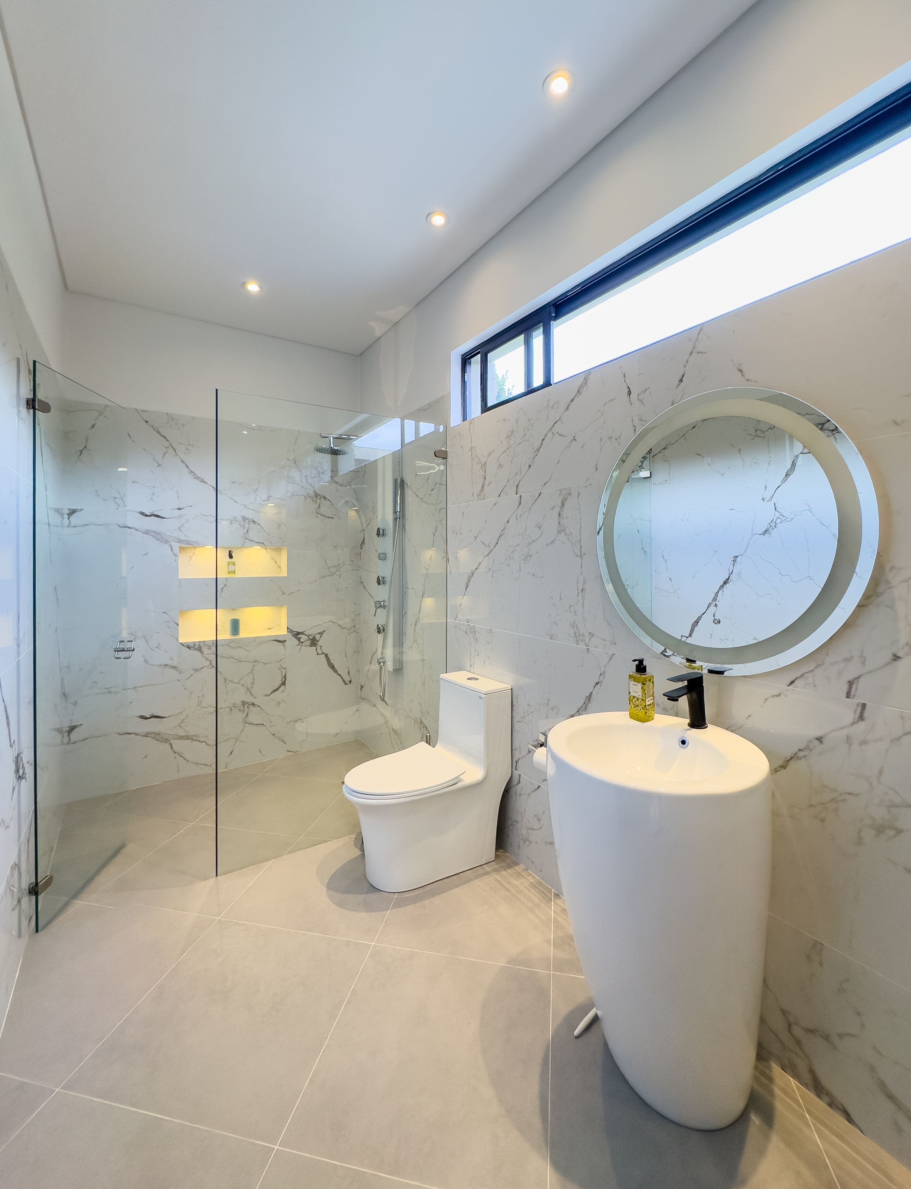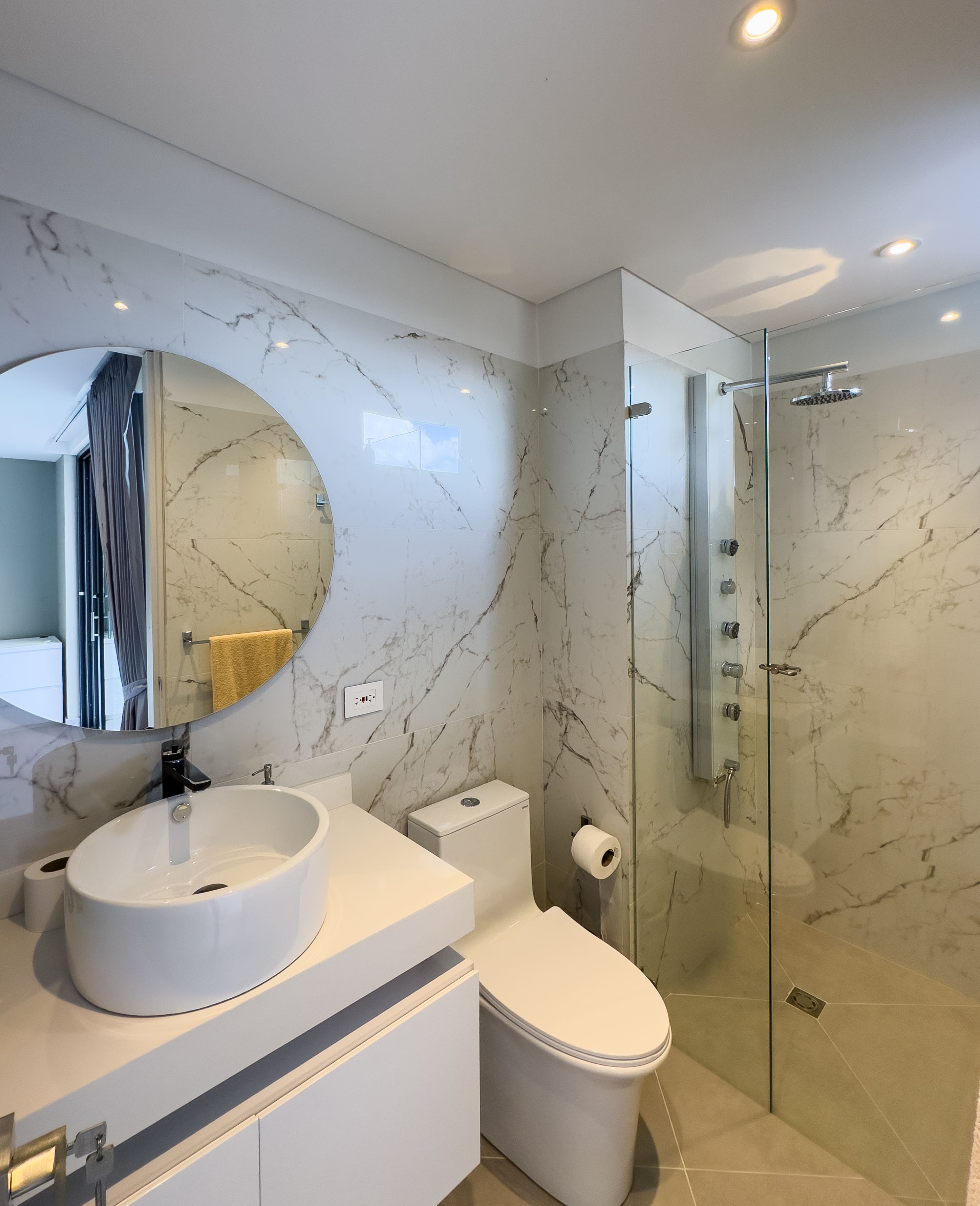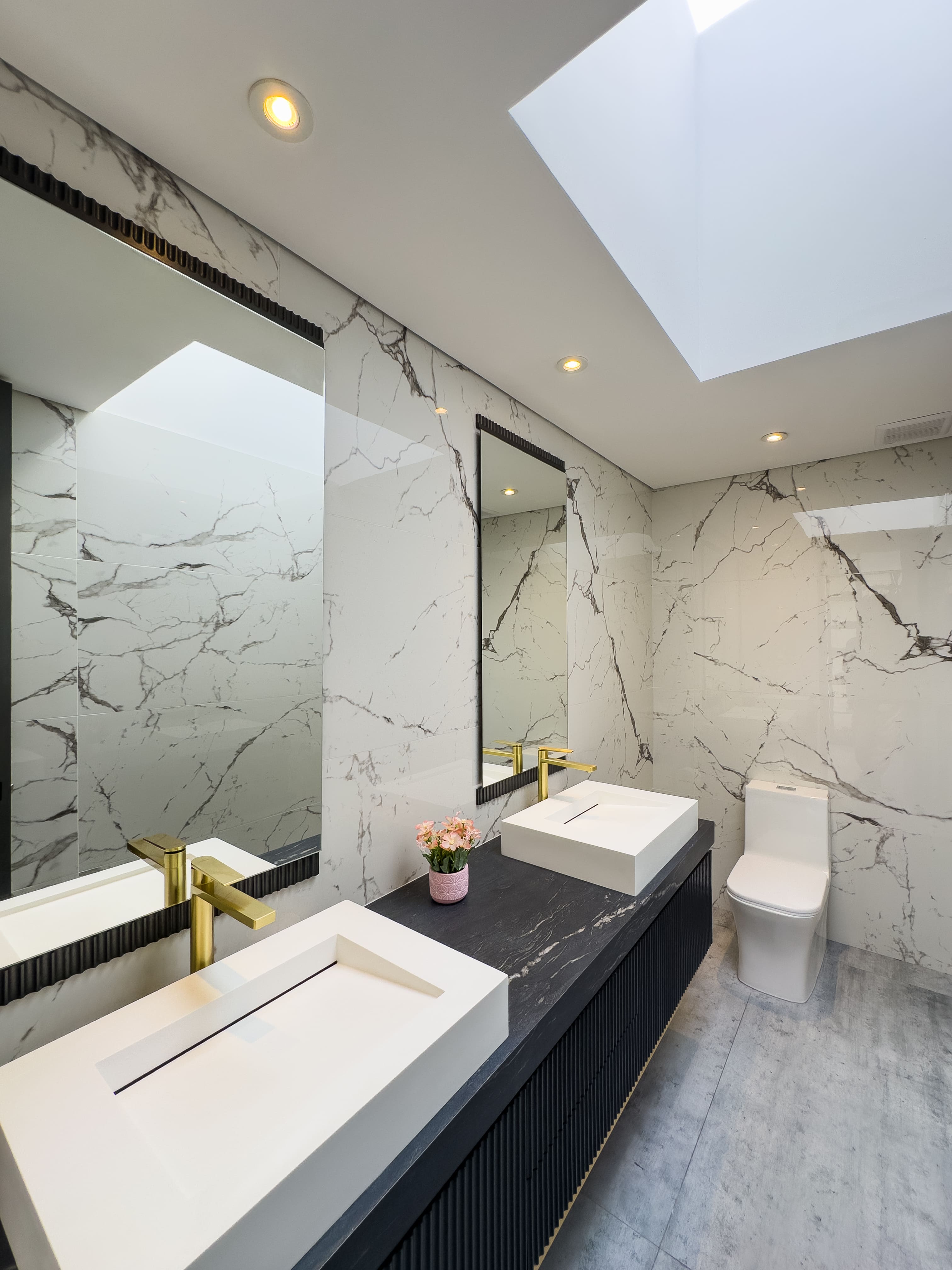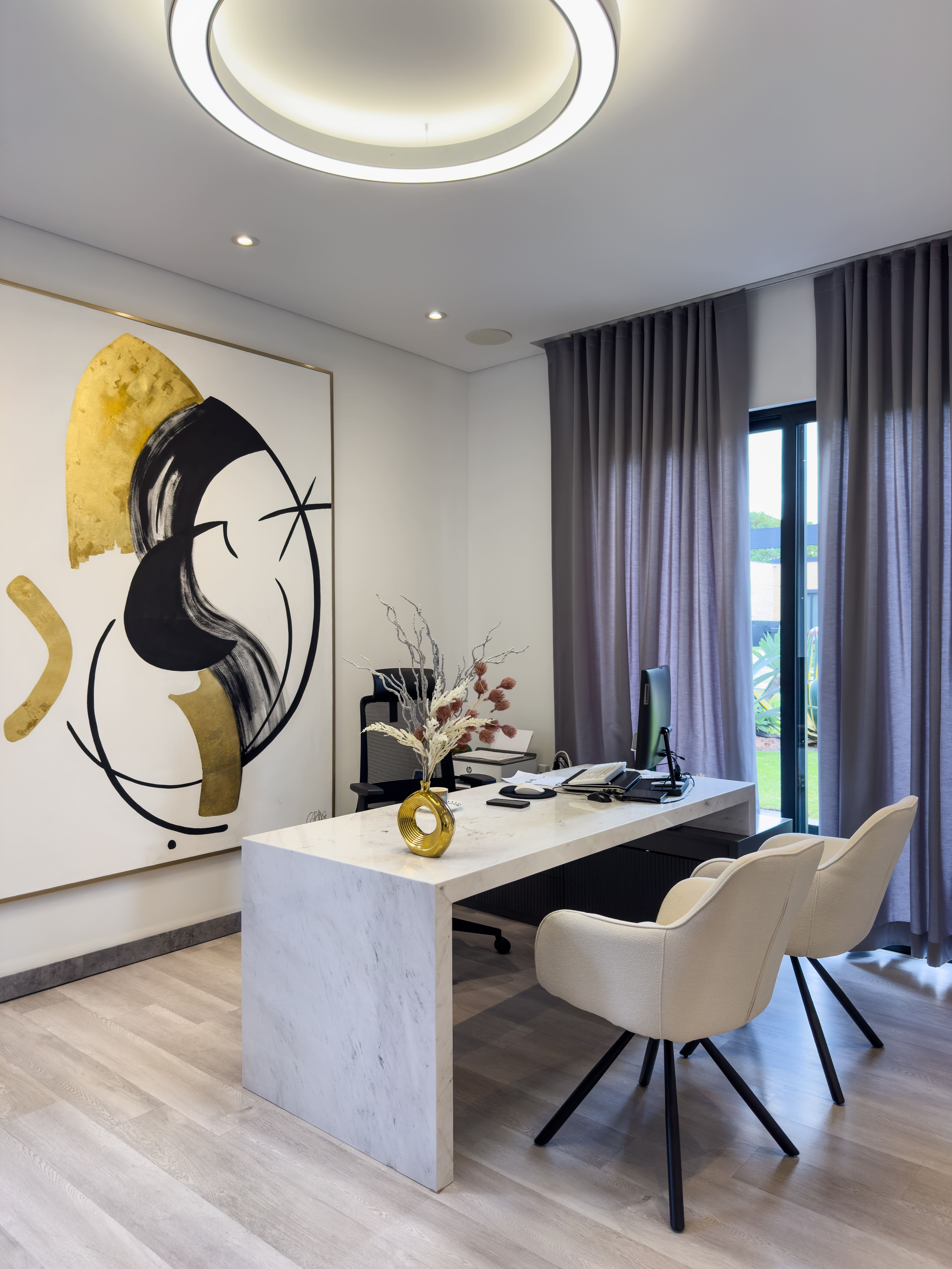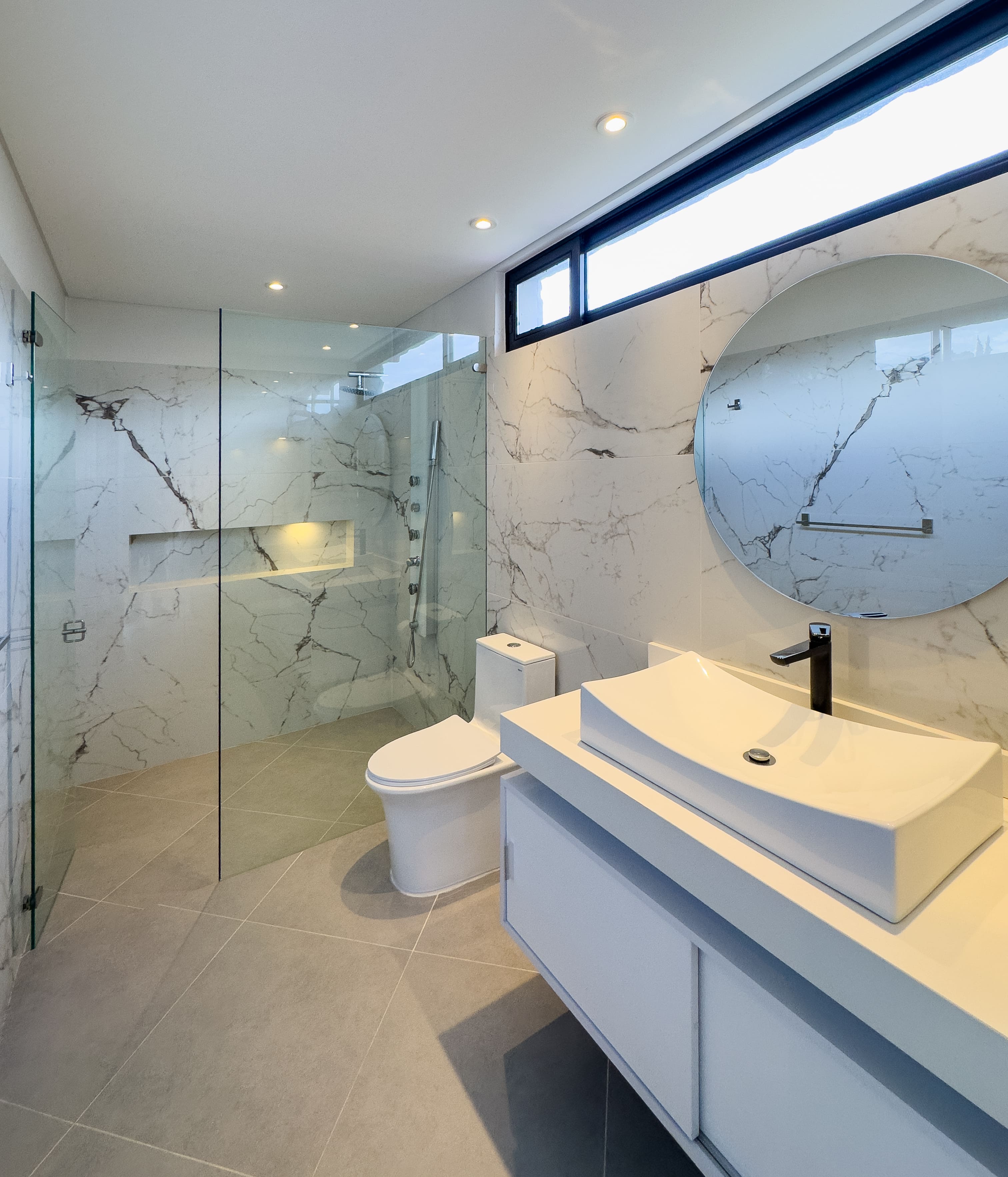 La casa ofrece tres alcobas con baño privado, con la posibilidad de incorporar una cuarta habitación en la primera planta, transformando el estudio actual en una suite adicional. En total cuenta con cinco baños y ocho garajes, un equilibrio poco común entre diseño, funcionalidad y comodidad, ideal para una vida familiar sofisticada sin renunciar al confort diario.