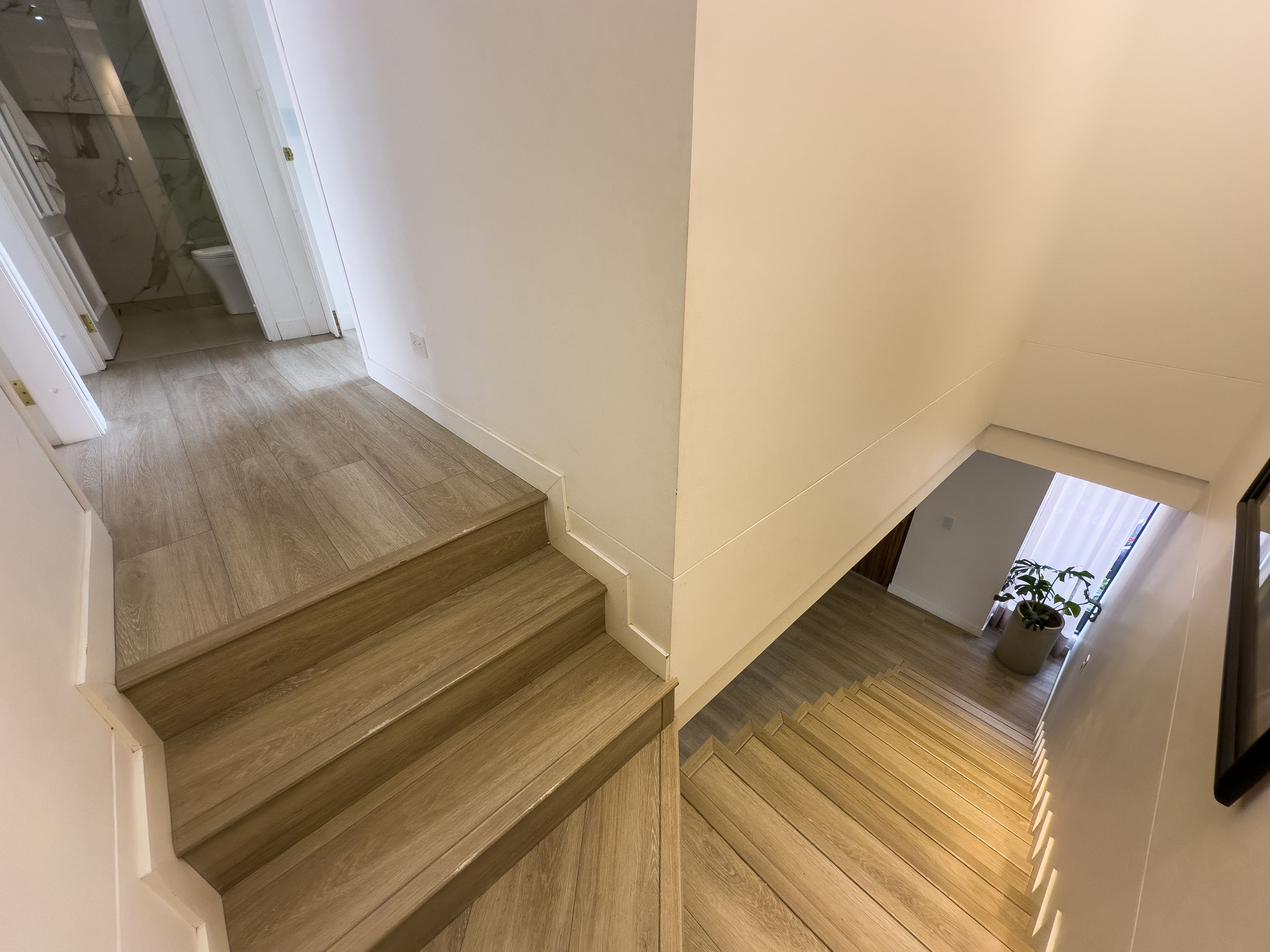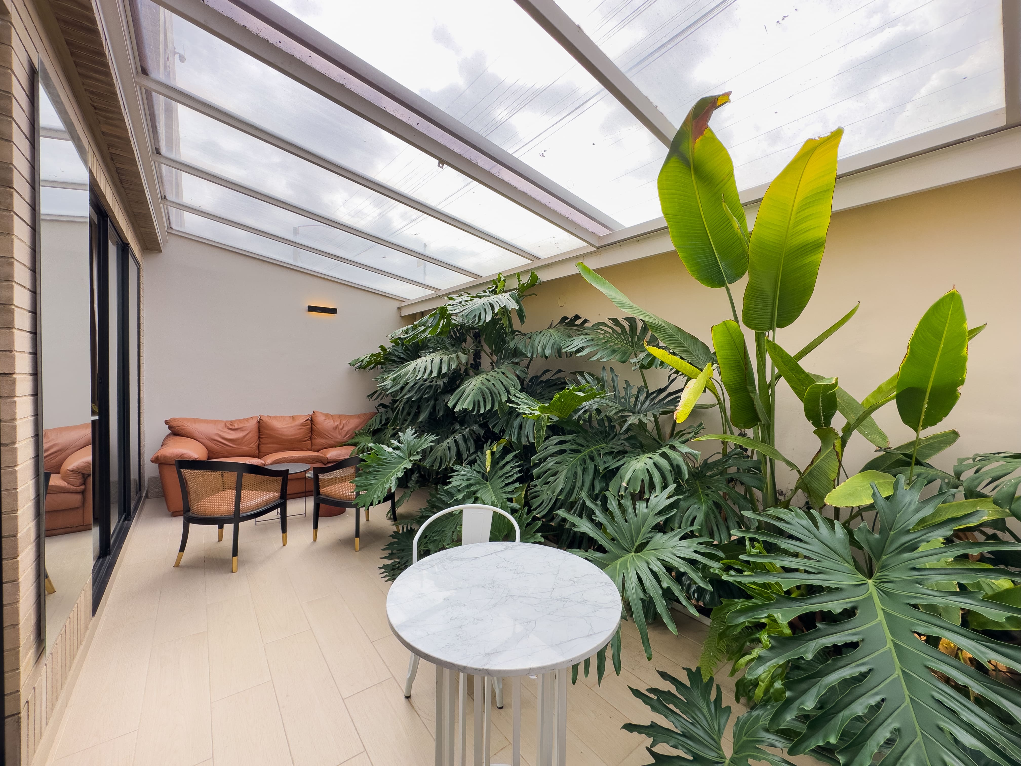 En el primer nivel se encuentra el área social, pensada para disfrutar y compartir: una sala y comedor amplios y bien iluminados, baño social, cocina de diseño moderno, zona de ropas independiente y una terraza techada con un cuidado diseño de vegetación, ideal para crear un espacio cálido y privado al aire libre.